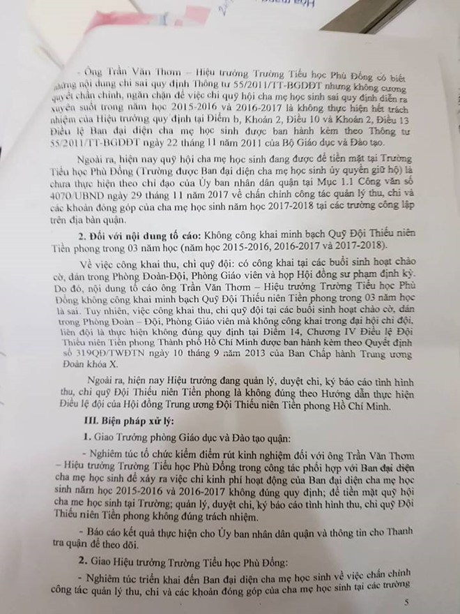 Bên cạnh đó, ông Thơm còn quản lý, duyệt chi, ký báo cáo tình hình thu chi quỹ Đội Thiếu niên Tiền Phong của trường là vi phạm quy định hướng dẫn tại Điều lệ của Hội đồng Trung ương Đội thiếu niên Tiền phong Hồ Chí Minh.
