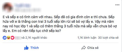 Sếp hứa với em là con trai 3 tuổi sếp lớn rồi thì sẽ bỏ vợ lấy em. Vậy mà năm nay nó học lớp 1 và sếp có thêm đứa 3 tuổi nữa mà sếp vẫn chưa bỏ vợ lấy em . Em phải làm sao giờ?"