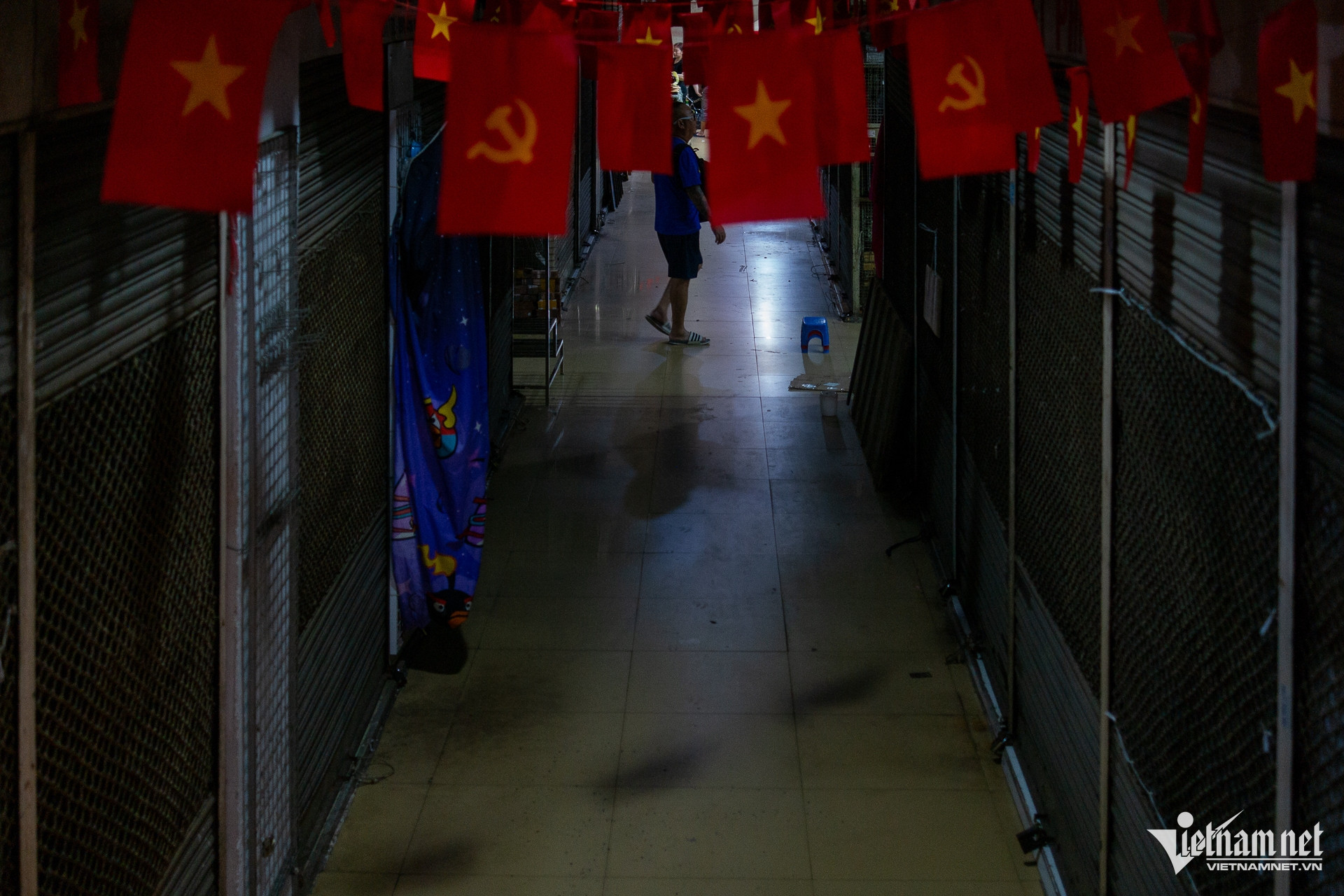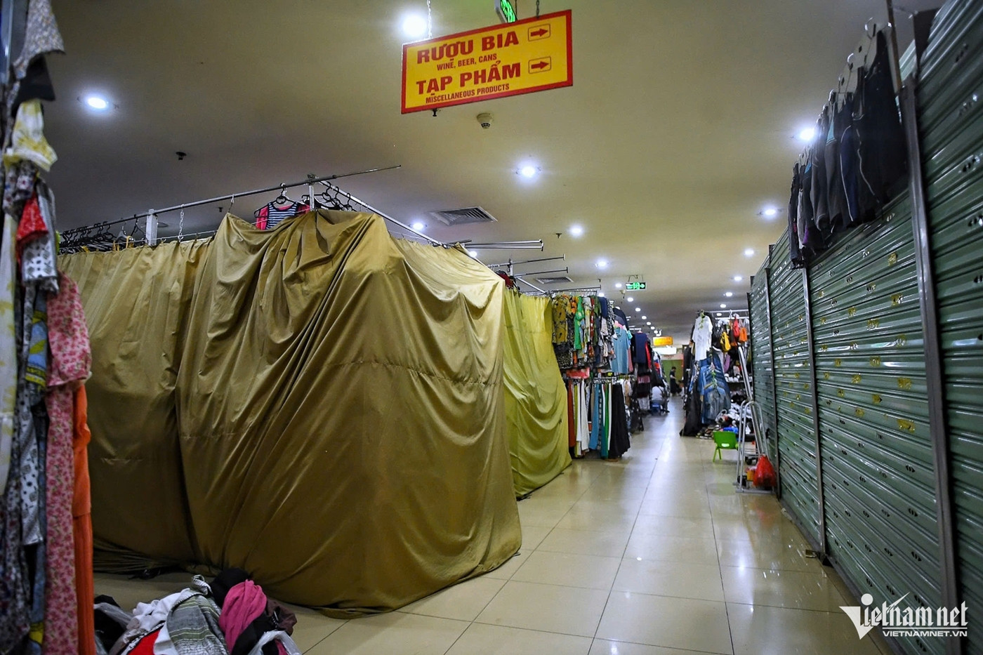 Đa số gian hàng đóng cửa, nghỉ bán mấy ngày qua nằm tại khu vực tầng 1 và lác đác tại tầng 2 và 3. Nhiều khu vực bên trong chợ vắng lặng lạ thường.