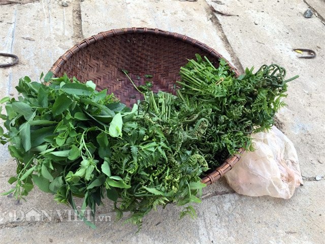 Đưa tay vào hai rổ tre đựng rau dớn và rau nhút, với khoảng chừng 30