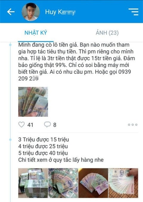 Thông tin mà Huy đưa ra kèm theo hình ảnh rất sống động: “Mình đang có lô tiền giả, bạn nào muốn tham gia hợp tác tiêu thụ thì liên hệ với mình theo số điện thoại 09392092...”.