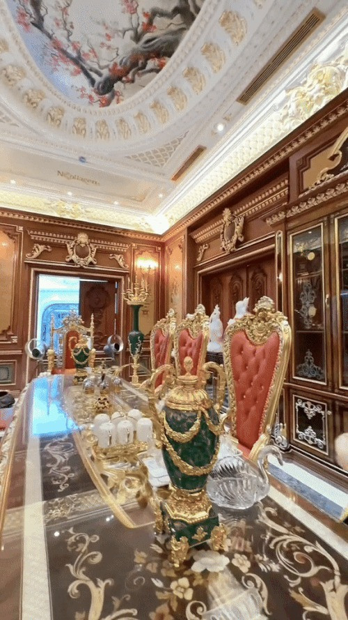 "Làm ở Việt Nam là đồ gỗ, còn đèn, đá, ngọc là chồng Ngân mua từ nước ngoài đem về lắp ráp", cô chia sẻ. Một trong những món đồ tâm đắc nhất được nhắc đến là chiếc đồng hồ đá khổng tước, được cho là "độc nhất vô nhị tại Việt Nam".