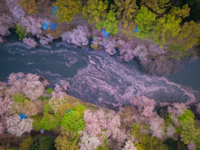 Cánh hoa anh đào rơi tạo ra dải nước màu hồng tuyệt đẹp dưới sông ở thành phố Tokyo, Nhật Bản.