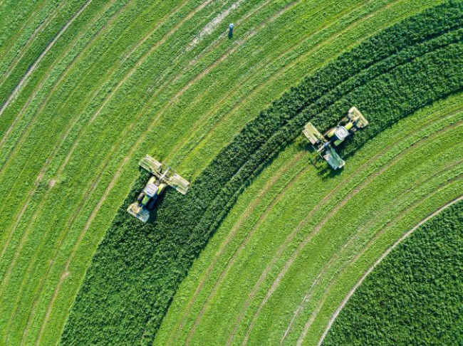 Nông dân thu hoạch cỏ để làm thức ăn cho bò sữa ở Punjab, Pakistan.