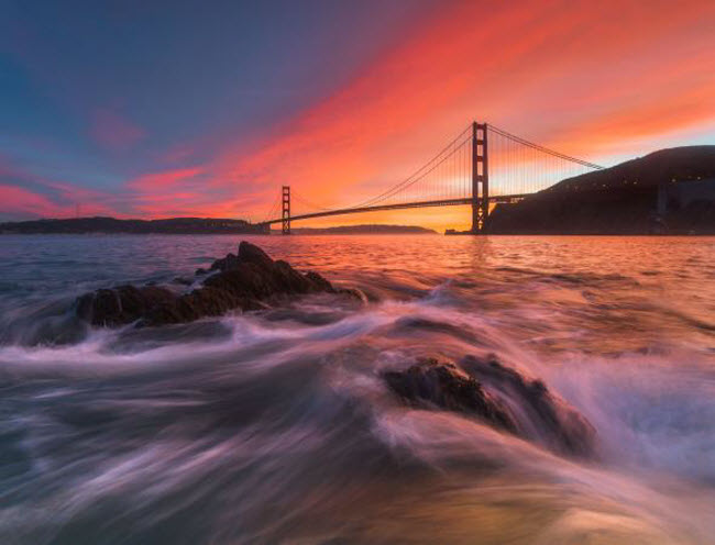 Khunh cảnh hoàng hôn tuyệt đẹp phía sau cổng Cổng vàng ở thành phố San Francisco, bang California, Mỹ.