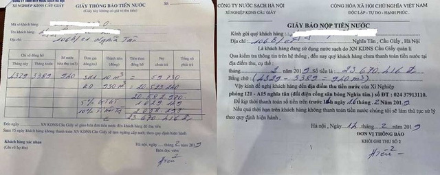 Giấy thông báo tiền nước tháng 2 với tổng số tiền hơn 23,6 triệu đồng mà chị Thu ở Nghĩa Tân (Cầu Giấy, Hà Nội) nhận được từ Xí nghiệp kinh doanh nước sạch Cầu Giấy.