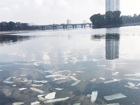 Những chiếc bao cao su nổi đầy trên mặt hồ.