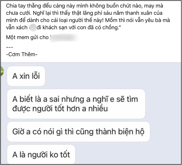 Nghĩ lại thì thấy thật lãng phí sáu năm thanh xuân của mình để dành cho cái loại người thế này! Mồm thì nói vẫn yêu bà mà vẫn đi khách sạn với con đã có chồng".