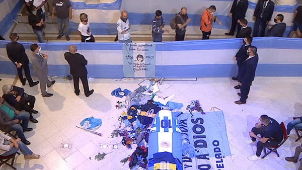 Thi thể của Maradona được quàn trong một chiếc quan tài bằng gỗ với quốc kỳ màu xanh và trắng cùng chiếc áo thi đấu của đội tuyển Argentina với số 10 sau lưng vốn gắn liền suốt sự nghiệp lẫy lừng.