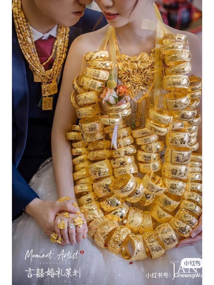 Hình ảnh cô dâu đeo khoảng 100 chiếc vòng làm bằng vàng khiến không ít người trầm trồ. Những chiếc vòng bản to được xiên lại thành vòng đeo cổ của cô dâu trong đám cưới. Chắc hẳn đây là đám cưới nhà "thế phiệt" rồi!