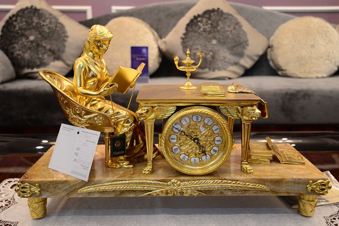 Chiếc đồng hồ bằng đồng được đúc thủ công, mạ vàng 24K, giá hơn 200 triệu đồng.