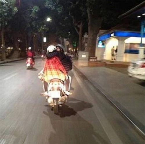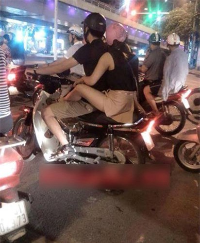 Cô gái quàng chân về phía trước quặp chặt bạn trai khi ngồi trên xe máy gây "chướng mắt" (Ảnh Dinh The Anh).