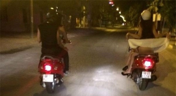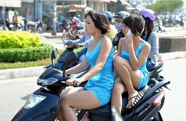 ảnh cô gái mặc quần soóc ngắn ngồi sau xe máy thản nhiên gác quắp chân
