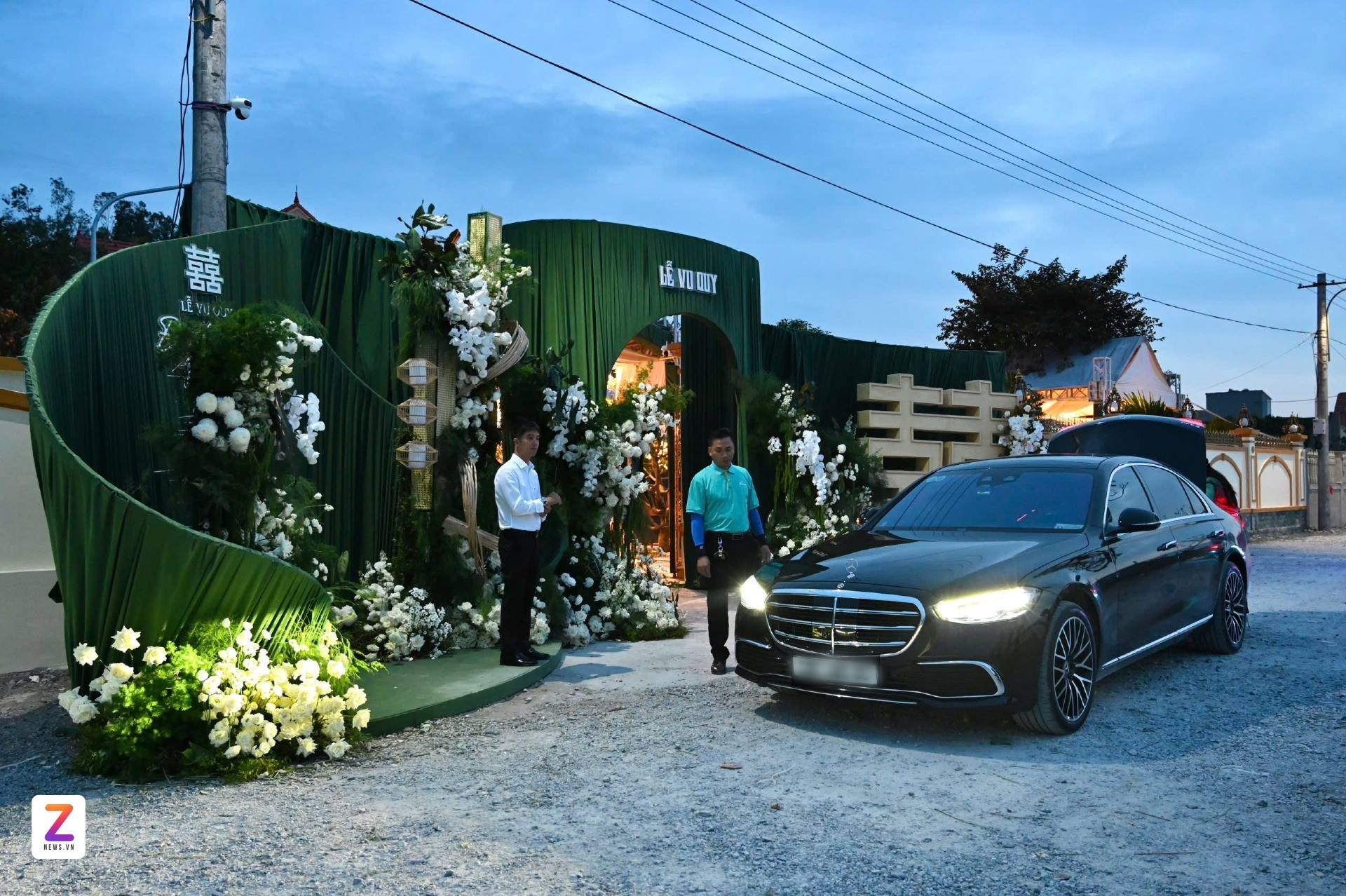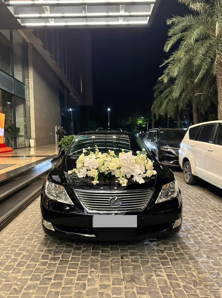 Chiếc xe đón dâu màu đen thương hiệu Lexus được trang trí hoa tươi tông màu xanh trắng, chuẩn concept phông cưới nhà hoa hậu Đỗ Thị Hà.