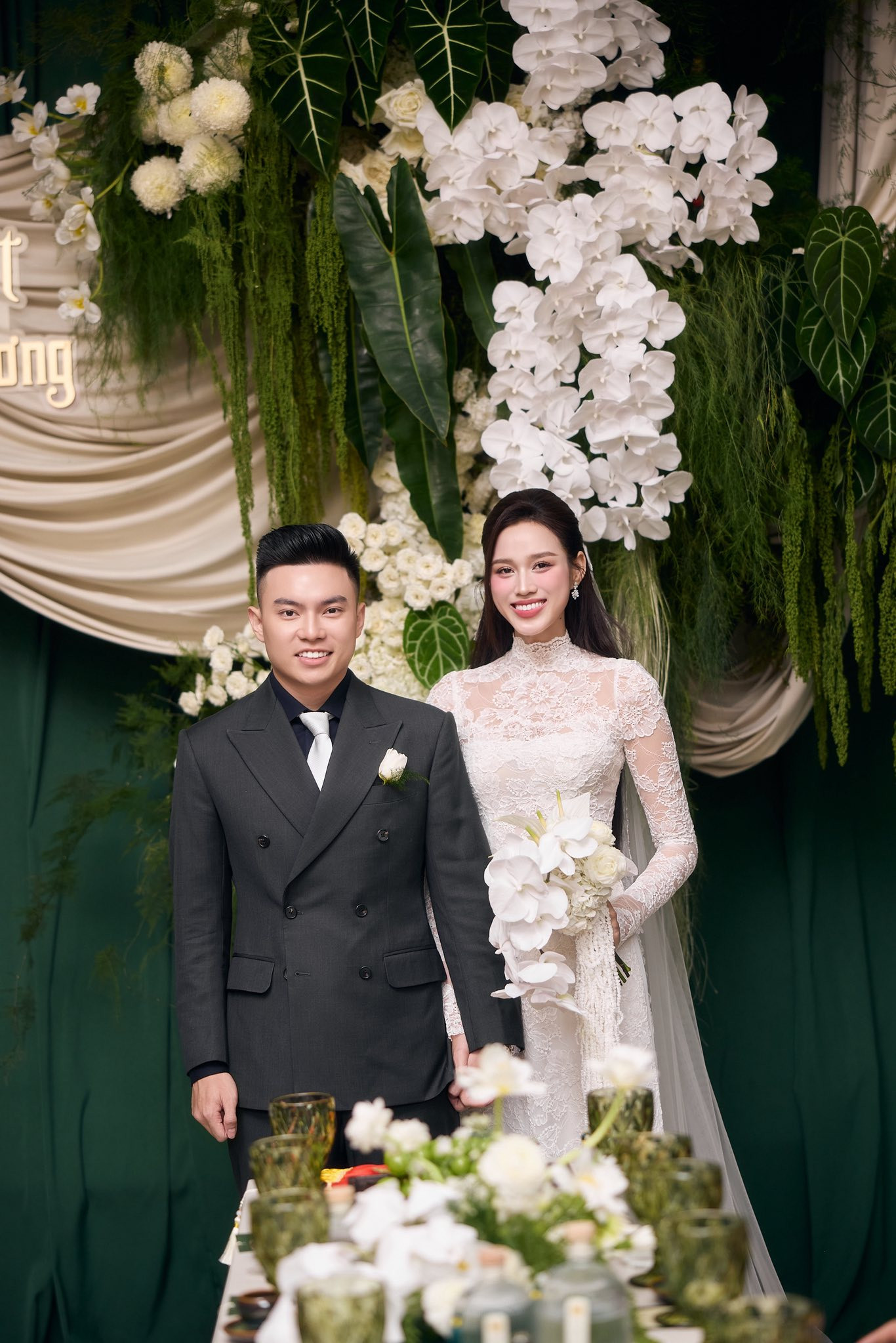 Khoảnh khắc cô dâu - chú rể hào môn xuất hiện lập tức gây sốt. Đỗ Thị Hà diện đầm cưới ren trắng tôn vóc dáng và khoe visual xinh xắn. Trong khi đó, chú rể mặc suit bảnh bao.