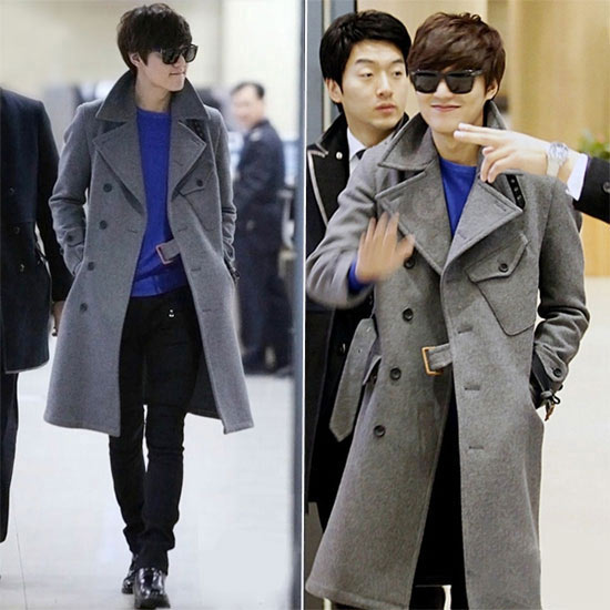 Nam tài tử xứ Hàn - Lee Min Ho diện quần jeans đen, áo xanh bên trong và áo choàng màu xám dáng dài. Với set đồ này, mỹ nam Hàn vô cùng phong cách và lịch lãm trên đường phố.
