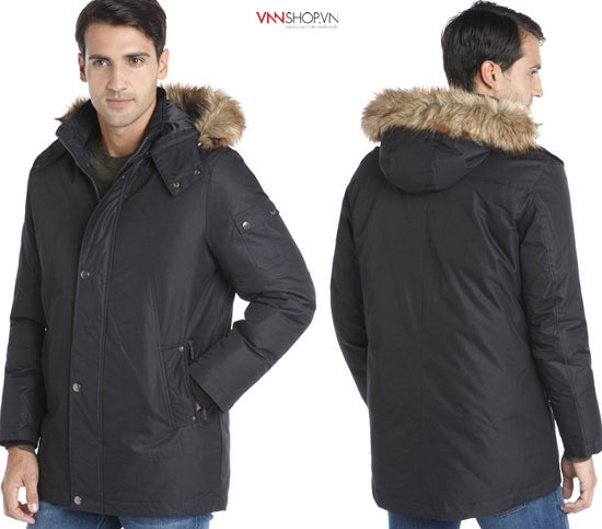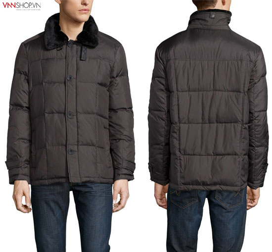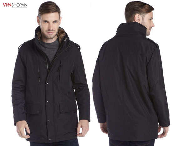 Áo khoác nam Kenneth Cole màu nâu đen, cổ lông trẻ trung và bắt mắt. Đường trần chỉ nổi trên bề mặt là điểm nhấn nhá cho chiếc áo thêm phần thú vị.