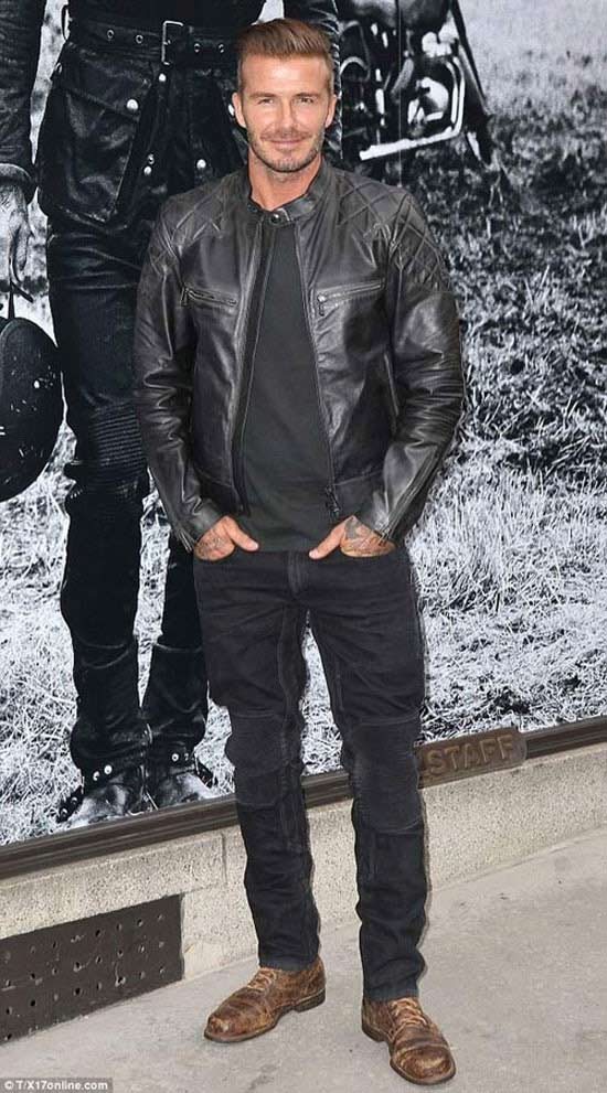 Cựu danh thủ bóng đá Anh - David Beckham năng động và nam tính với áo khoác da lửng phối cùng quần jeans và giày cá tính.