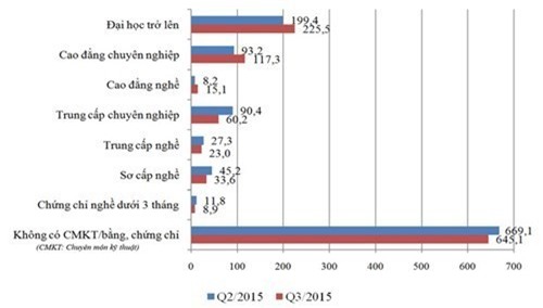 Báo cáo mới nhất của Viện Khoa học Lao động và Xã hội, Bộ Lao động Thương binh và Xã hội ngày 24/12/2015 cho thấy, tỷ lệ thất nghiệp chung đã giảm nhưng số lượng người có trình độ đại học, sau đại học thất nghiệp tăng cao: 225.500 người.