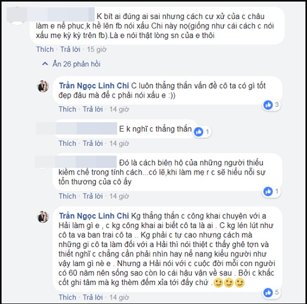 Cho rằng Linh Chi không thẳng thắn như lời cô thừa nhận, Facebooker này tiếp tục nêu quan điểm: "Đó là cách biện hộ của những người thiếu kiềm chế trong tính cách. Có lẽ khi làm mẹ rồi chị sẽ hiểu sự tổn thương của cô ấy".