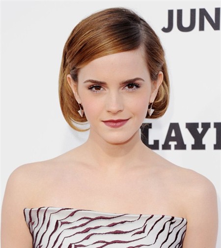 Emma Watson khéo léo tạo sự cân đối cho gương mặt trái tim bằng một phần mái lệch được vuốt chéo che bớt phần trán rộng.