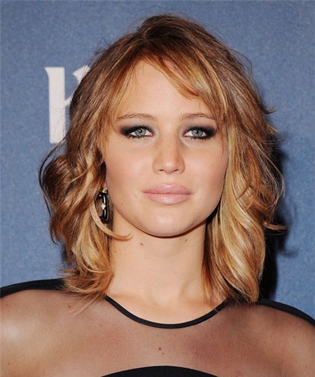 Gương mặt tròn của Jennifer Lawrence được kéo dài hơn nhờ cách để mái ngắn và rẽ chéo giúp tăng góc cạnh cho gương mặt.