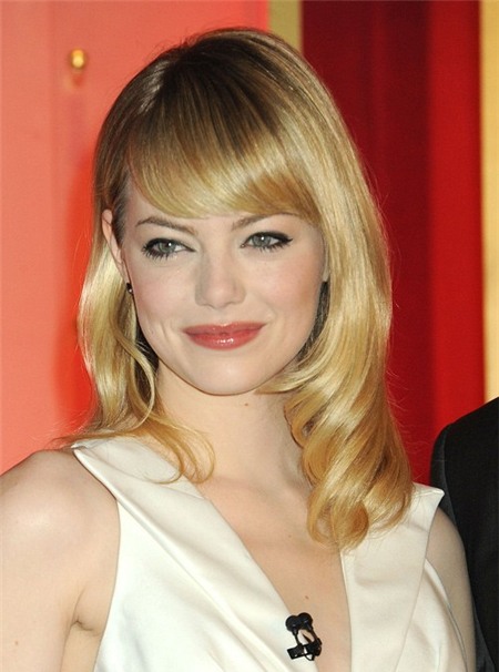 Emma Stone cũng có gương mặt tròn và cô chọn giải pháp mái bằng chéo để tạo góc cạnh và độ dài cho gương mặt.