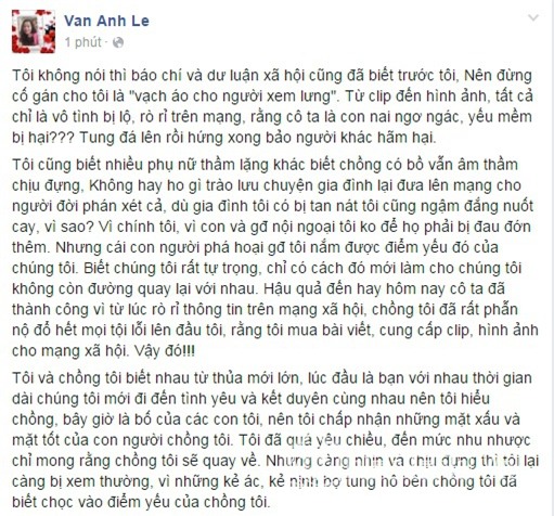 Trước những lời lẽ của chồng mình bảo vệ nhân tình và những lời "vu khống" của chồng cho rằng mình bịa chuyện, mua tin báo chí để bôi nhọ Hồ Ngọc Hà, vợ đại gia V.A đã viết một bức tâm thư khá dài để "vạch mặt' âm mưu của Hồ Ngọc Hà, đồng thời tố cáo việc chồng ngoại tình.
