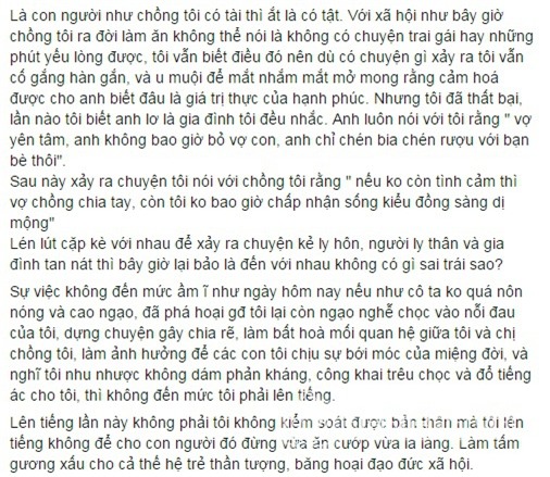 Sự việc không đến mức ầm ĩ như ngày hôm nay nếu như cô ta không quá nôn nóng và cao ngạo, đã phá hoại gia đình tôi lại còn ngạo nghễ chọc vào nỗi đau của tôi, dựng chuyện gây chia rẽ, làm bất hoà mối quan hệ giữa tôi và chị chồng tôi, làm ảnh hưởng để các con tôi chịu sự bới móc của miệng đời, và nghĩ tôi nhu nhược không dám phản kháng, công khai trêu chọc và đổ tiếng ác cho tôi, thì không đến mức tôi phải lên tiếng.