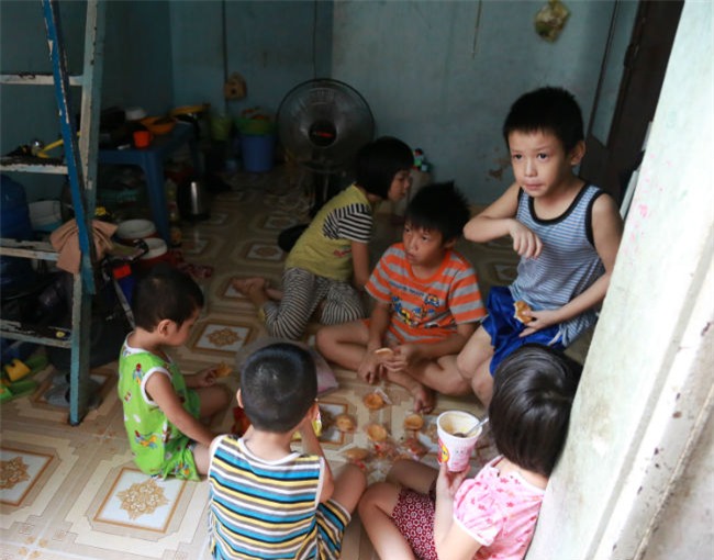 Thấy một bé gái cầm hộp mỳ gói, bên trong chỉ có cơm trắng. Bé cười tủm rồi quay vào nhà, ngồi gọn một góc. Bé Hưng liền trả lời giúp em: “Nó đói quá nên ăn nốt chỗ cơm nguội với nước mỳ còn thừa từ sáng. Con bảo đợi mẹ về nấu cơm nhưng không chịu”.