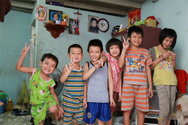 Hỏi về các thành viên trong gia đình, bé Hưng (8 tuổi) khoe: “Nhà con có 11 anh chị em, gồm 8 trai và 3 gái. Các anh lớn đã đi làm kiếm tiền phụ giúp mẹ. Hằng ngày, con và 2 em út cùng mẹ bán vé số nhưng bữa nay chúng con ngủ quên. Còn chị Tư lo nấu cơm, dọn dẹp nhà cửa. Thi thoảng, chị và các em hay đến lớp học tình thương của cha xứ”.