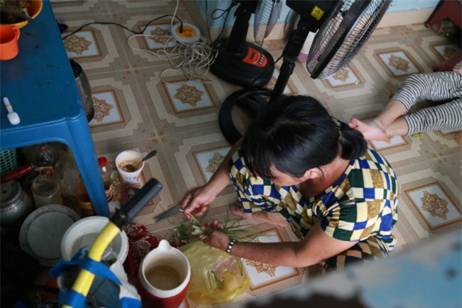Lúc sau, bé út reo lên: “A! Mẹ về. Mẹ có mua thịt?”. Chị Loan gật đầu, đặt túi đồ ăn xuống chiếc bàn nhựa. Bé út mở ra, chúng tôi thấy chỉ có ít thịt, bọc dưa muối sẵn và một củ dền. Chị vừa nấu cơm vừa kể về cuộc sống của 12 mẹ con những tháng ngày qua.