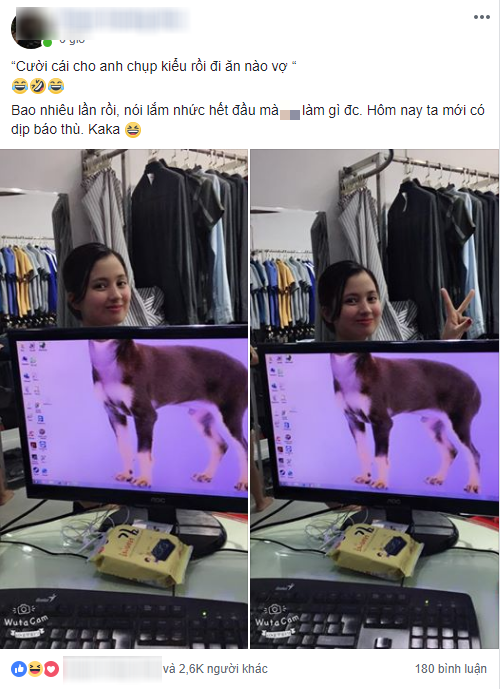 Đính kèm bức ảnh là lời bộc bạch khá dễ thương và có phần đắc thắng của anh chồng "bá đạo": "Cười cái cho anh chụp kiểu rồi đi ăn nào vợ". Đấy các bác ạ, bao nhiêu lần rồi, nói lắm nhức hết đầu mà không làm gì được. Hôm nay ta mới có dịp báo thù. Haha".