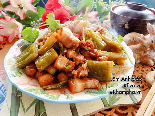 Tiếp đến cho nước dừa tươi cùng các gia vị còn lại vào, rim 10 phút. Cuối cùng cho mướp đắng vào đảo đều, rim cho nước sánh mịn, mướp mềm. Nêm nếm lại cho vừa ăn là tắt bếp. Thịt kho mướp đắng cho ra đĩa rắc ngò và chút tiêu. Món này dùng với cơm rất ngon.