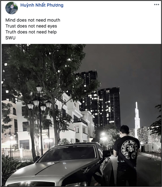 Dòng trạng thái ẩn ý được chồng Thu Thủy đăng tải sau ồn ào con trai bị bố dượng cấu tay (Tạm dịch: Tâm không cần miệng. Lòng tin không cần mắt. Sự thật không cần giúp đỡ)