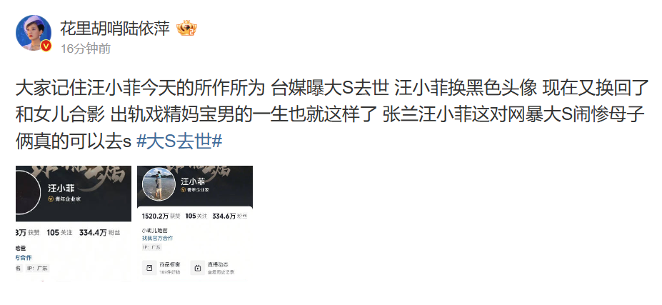 "Mọi người hãy nhớ việc Uông Tiểu Phi làm hôm nay. Truyền thông Đài Loan đưa tin Đại S (Từ Hy Viên) qua đời. Uông Tiểu Phi đổi ảnh đại diện thành nền đen. Bây giờ anh ta chuyển lại thành hình chụp với con gái. Lúc sống thì lừa dối, thích đóng kịch. Trương Lan (mẹ chồng cũ) và Uông Tiểu Phi đã bắt nạt Đại S và khiến hai mẹ con khốn khổ. Điều này (việc thương tiếc) thực sự có thể xảy ra sao?" - Một cư dân mạng bức xúc chia sẻ.