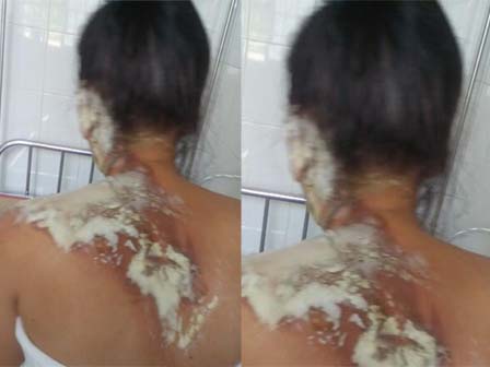 Bà Lệ bị phỏng nặng do chồng bạo hành bằng nước sôi. Tai trái đã không thể nghe được nữa....