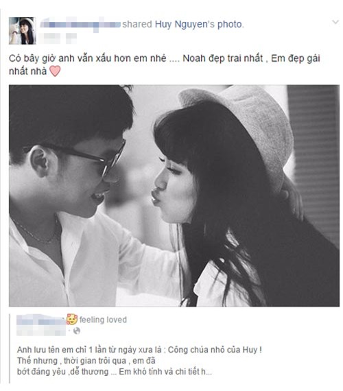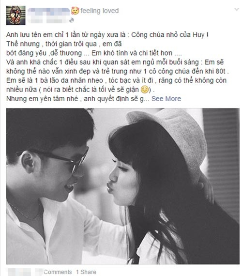 Nhiều người cho rằng chồng Diễm Hương đang học cách tỏ tình của Huỳnh Hiểu Minh với Angela Baby. Anh ngọt ngào chia sẻ: "Anh lưu tên em chỉ 1 lần từ ngày xưa là: Công chúa nhỏ của Huy! Thế nhưng, thời gian trôi qua, em đã bớt đáng yêu, dễ thương... Em khó tính và chi tiết hơn...".