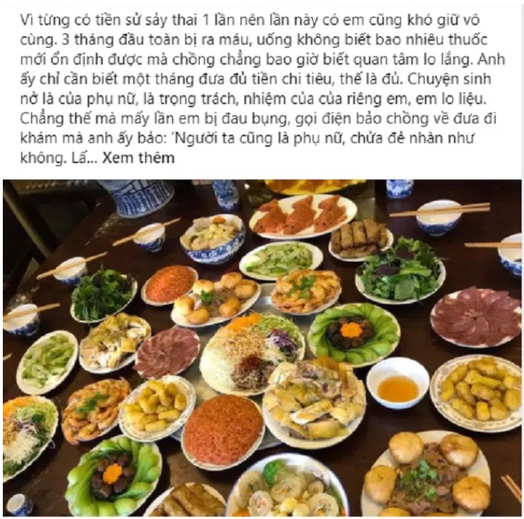 Mới đây trên mạng xã hội cũng chia sẻ câu chuyện của một người vợ than thở về cảnh lấy phải chồng vô tâm như sau: "Vì từng có tiền sử sảy thai 1 lần nên lần này có em cũng khó giữ vô cùng. 3 tháng đầu toàn bị ra máu, uống không biết bao nhiêu thuốc mới ổn định được mà chồng chẳng bao giờ biết quan tâm lo lắng. Anh ấy chỉ cần biết một tháng đưa tiền chi tiêu, thế là đủ. Chuyện sinh nở là của phụ nữ, là trách nhiệm của riêng em, em lo liệu. Chẳng thế mà mấy lần em bị đau bụng, gọi điện bảo chồng về đưa đi khám anh ấy bảo: 'Người ta cũng là phụ nữ, chửa đẻ nhàn như không. Lấy em về đúng là như lấy nợ'.