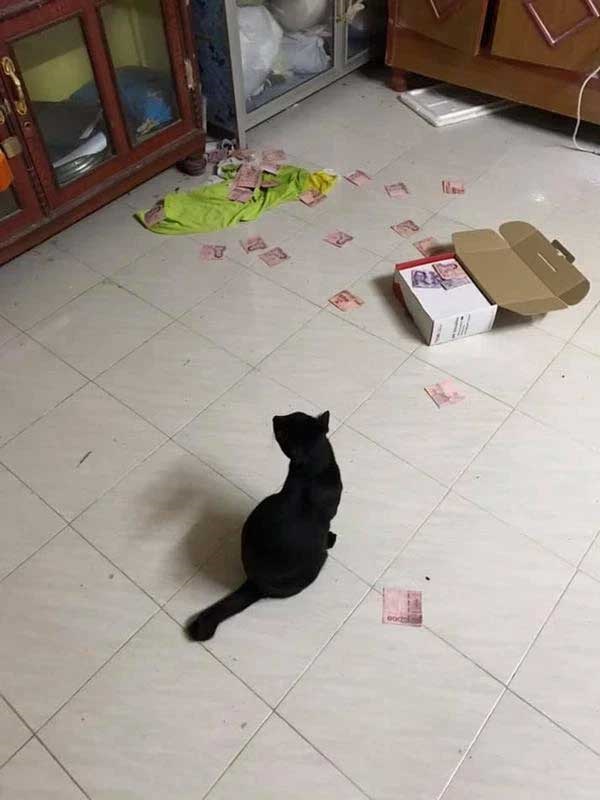 Tuy nhiên, vào 1 ngày đẹp trời, khi chú mèo cưng của chị quậy tưng bừng khiến 1 chiếc hộp giấy rơi ra, chị Kanuengnuch đã "chết sững" khi phát hiện những tờ 100 baht, rơi vung vãi trên sàn nhà.