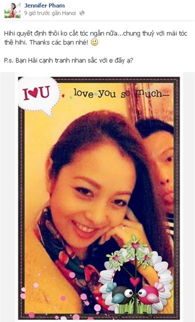 Trước đó, Jennifer Phạm khoe một bức ảnh có mái tóc cắt ngắn và cô định để kiểu tóc này trong năm mới. Tuy nhiên, sau khi tham khảo ý kiến của nhiều fan hâm mộ, Hoa hậu châu Á tại Mỹ quyết định: "thôi không cắt tóc ngắn nữa, chung thủy với mái tóc thề".