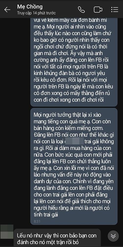 Tuy nhiên, đặc biệt nhất chính là thái độ của mẹ chồng. Nàng dâu này khi xích mích với chồng đã kể lại cho mẹ toàn bộ sự việc. Từ chuyện cô đăng bài bán hàng bị chồng "cà khịa" cho đến những việc về sau.