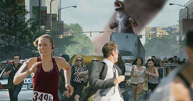 Stephanie hòa cùng dòng người chạy trốn khỏi quái vật Godzilla.