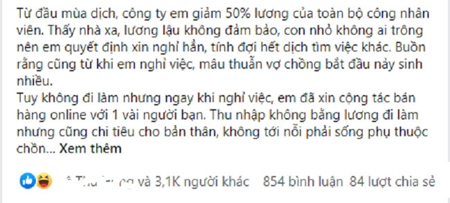 "Từ đầu mùa dịch, công ty em giảm 50% lương của toàn bộ công nhân viên. Thấy nhà xa, lương lậu không đảm bảo, con nhỏ không ai trông nên em quyết định xin nghỉ hẳn, tính đợi hết dịch tìm việc khác. Buồn rằng cũng từ khi em nghỉ việc, mâu thuẫn vợ chồng bắt đầu nảy sinh nhiều.