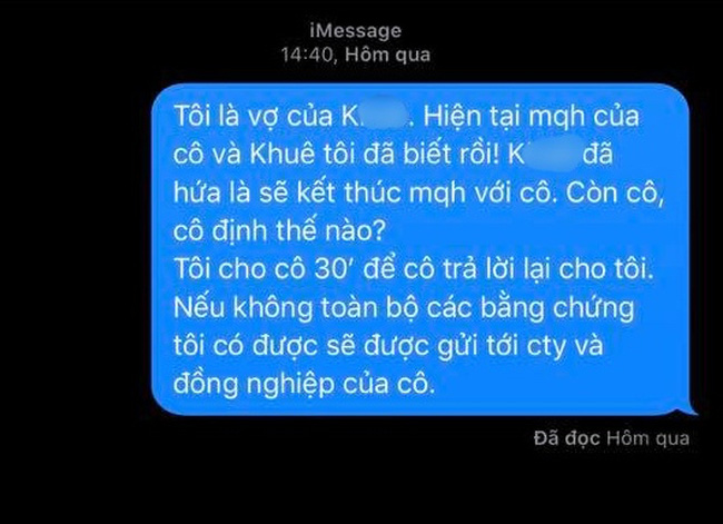 "Tôi là vợ của K. Hiện tại mối quan hệ của cô và K. tôi đã biết rồi. K. đã hứa sẽ kết thúc mối quan hệ với cô. Còn cô, cô định thế nào?