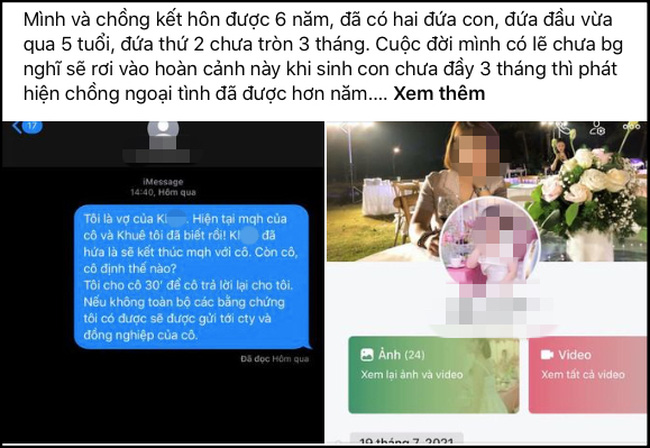 Đây là bài viết cô vợ đăng tải. Đính kèm là những tin nhắn của chồng và kẻ thứ ba. Cô nhân tình thoải mái gọi chồng người khác là anh yêu, vui mừng vì "lại thêm một năm nữa được bên nhau".