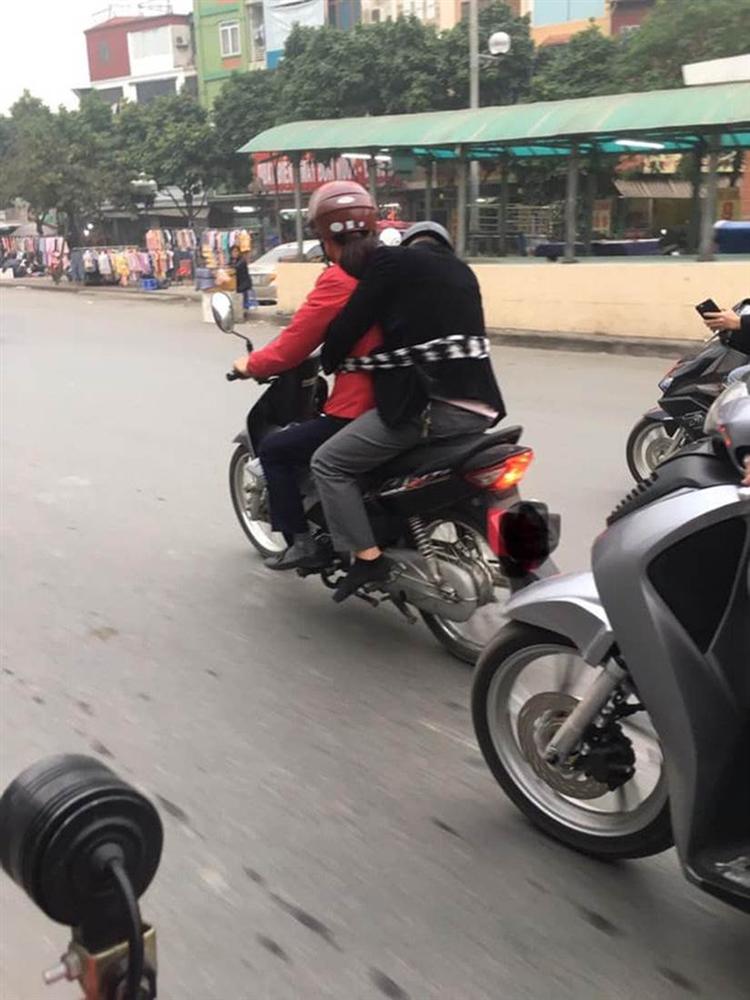 Chị để chồng ngồi sau xe máy, buộc vào bụng mình bằng một chiếc khăn. Vừa đi, chị vừa phải canh chừng chồng vì anh này không đủ tỉnh táo, thậm chí còn gục đầu vào vai vợ.