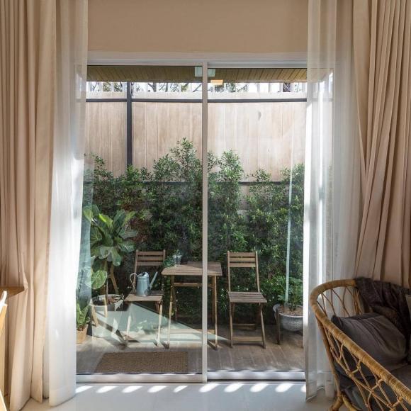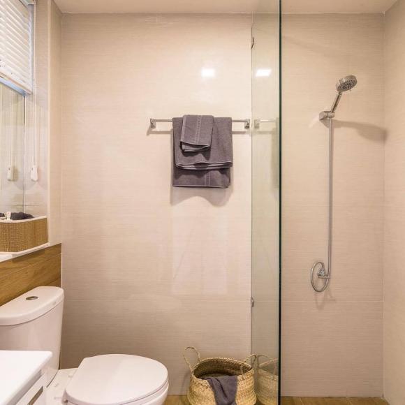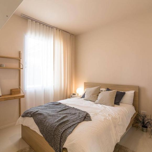 Ngôi nhà 1 tầng nhỏ, diện tích khoảng 50-60m2. Không gian được phân bố hợp lý, diện tích không lớn nhưng vẫn thoải mái, thoáng đãng. Đặt khu vực bếp ở cuối nhà để không bị bám mùi, ảnh hưởng tới các không gian sinh hoạt khác. Tông màu chủ đạo được sử dụng là màu kem, màu trắng và màu gỗ nâu nhạt, tạo nên sự ấm cúng, dịu mắt.