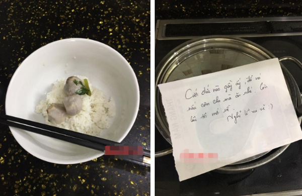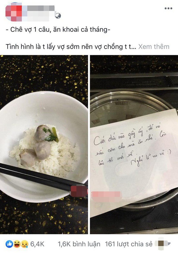 Không những thế, trong bữa ăn chỉ cơm với khoai dành cho chồng dịp nghỉ lễ này, cô vợ còn nhắn gửi: "Cưới đứa nào gầy ấy, để nó nấu cơm cho mà ăn nhé! Còn lâu tôi mới về. Nghỉ lễ vui vẻ!".