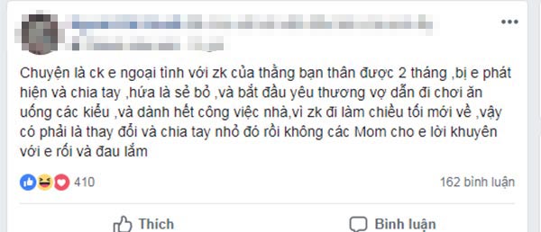 Theo lời kể, chị phát hiện chồng ngoại tình với vợ của bạn thân được 2 tháng. Khi sự việc vỡ lở, chồng chị đã chia tay, hứa sẽ không bao giờ qua lại với người phụ nữ kia nữa. Để mau chóng hàn gắn đổ vỡ, chồng chị N.Đ.K liên tục dẫn vợ đi chơi, đi ăn hàng và làm hết mọi việc nhà giúp vợ. Thế nhưng, dù chồng có thay đổi nhiều đến thế nào trong lòng chị N.Đ.K vẫn cảm thấy hoang mang bởi không biết chồng đã chấm dứt hẳn với nhân tình hay chưa.